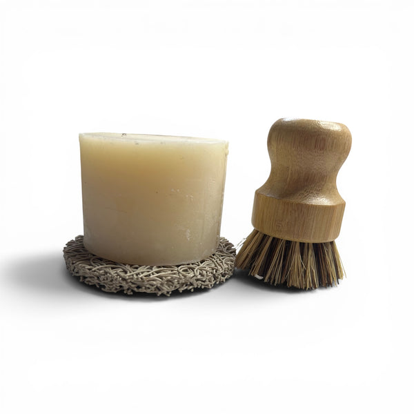 Rowe Family Farms Eco Friendly Zero Waste Vegan Solid Dish Soap cuts through grease and grime on dishes, pots and pans with a right sudsy lather. Safe for all kitchen surfaces, Palm Free, Sulfate Free and Septic Tank Safe.