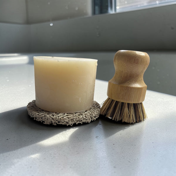 Use: Use damp/wet sponge, Bamboo Kitchen scrubber or mildew resistant kitchen cloth and rub top of dish soap to create rich sudsy lather. Wash dishes as normal and rinse thoroughly. Repeat as needed. Allow Dish Soap to dry between use to maximize life span of product.